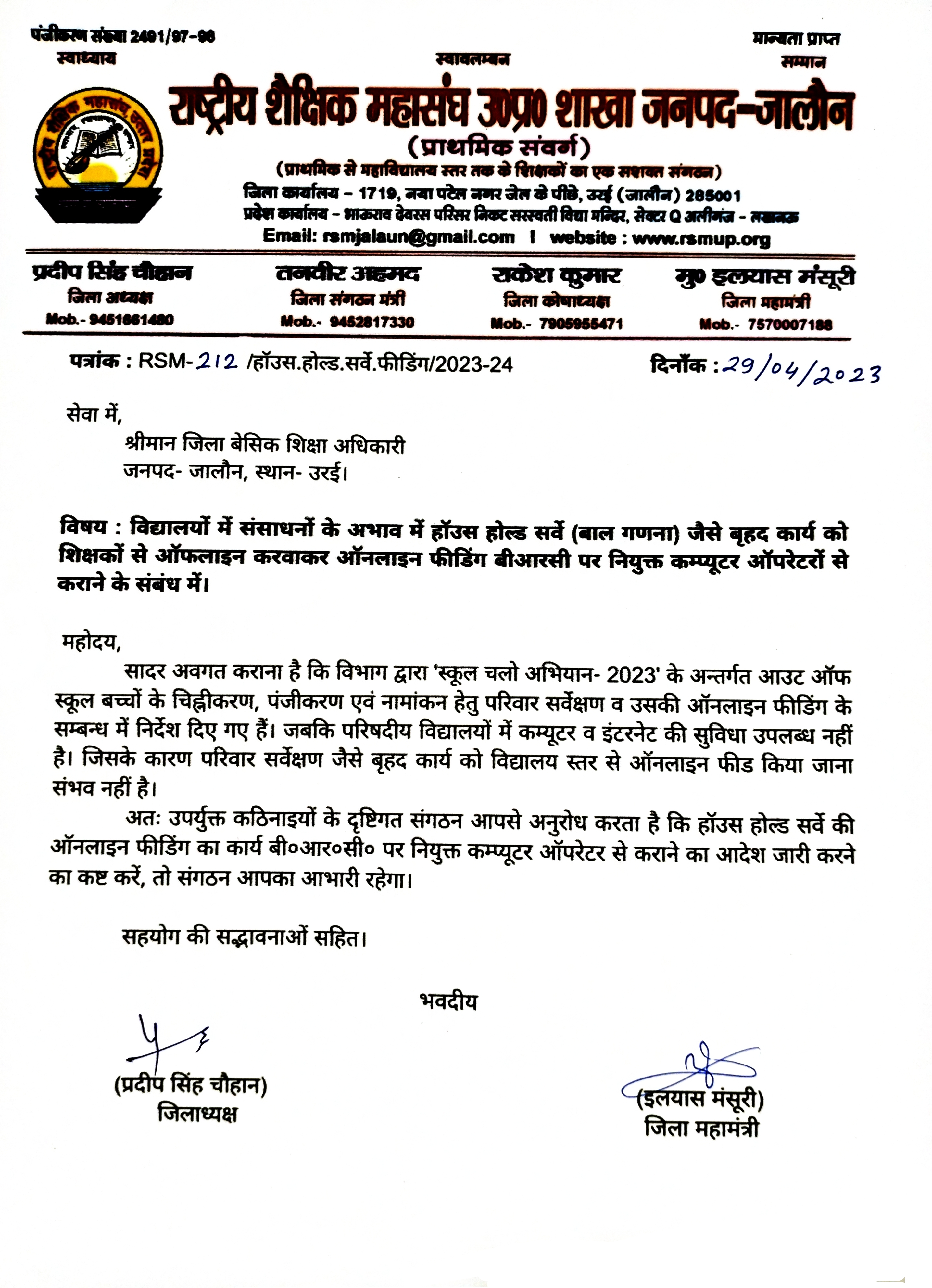 जिला महामंत्री इलयास मंसूरी ने कहा कि विभाग द्वारा शिक्षकों को 'स्कूल चलो अभियान- 2023' के अन्तर्गत आउट ऑफ स्कूल बच्चों के चिह्नीकरण, पंजीकरण एवं नामांकन हेतु परिवार सर्वेक्षण व उसकी ऑनलाइन फीडिंग के सम्बन्ध में निर्देश दिए गए हैं। जबकि परिषदीय विद्यालयों में कम्यूटर व इंटरनेट की सुविधा उपलब्ध नहीं है। जिसके कारण परिवार सर्वेक्षण जैसे बृहद कार्य को विद्यालय स्तर से ऑनलाइन फीड किया जाना संभव नहीं है।